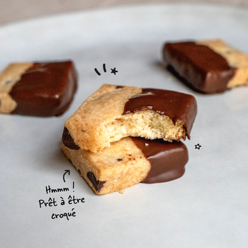 5️⃣ Faites fondre le chocolat et trempez vos petits sablés jusqu’à la moitié ! Laissez refroidir jusqu’à ce que le chocolat durcisse. Et hop c’est prêt, vous pouvez déguster 😉