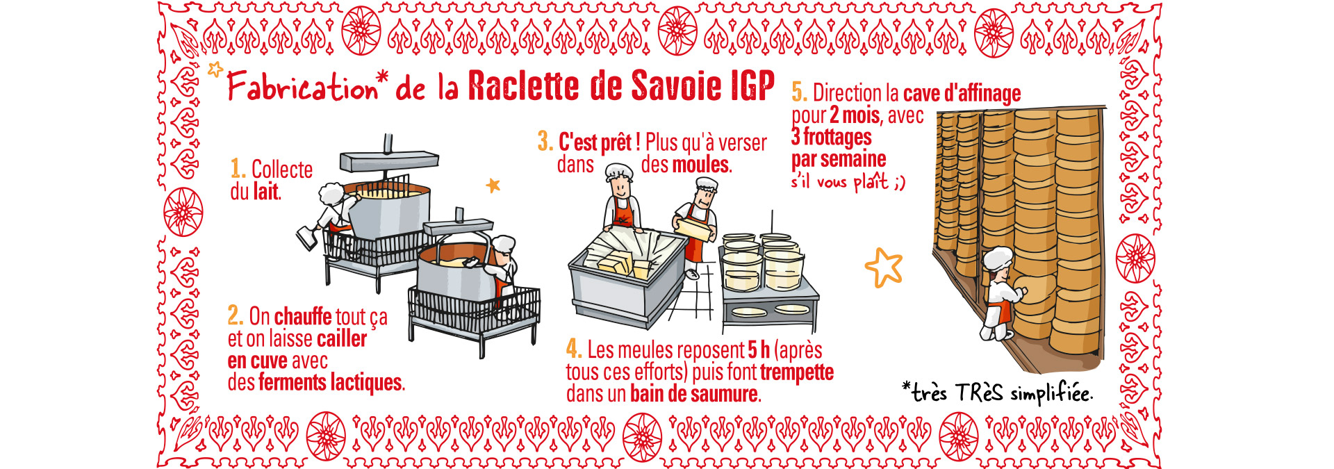 De la collecte à l’affinage, la Raclette de Savoie IGP est rigoureusement concoctéeen Pays de Savoie, grâce au lait de 3 vaches : la Montbéliarde, l’Abondance, et la Tarentaise.