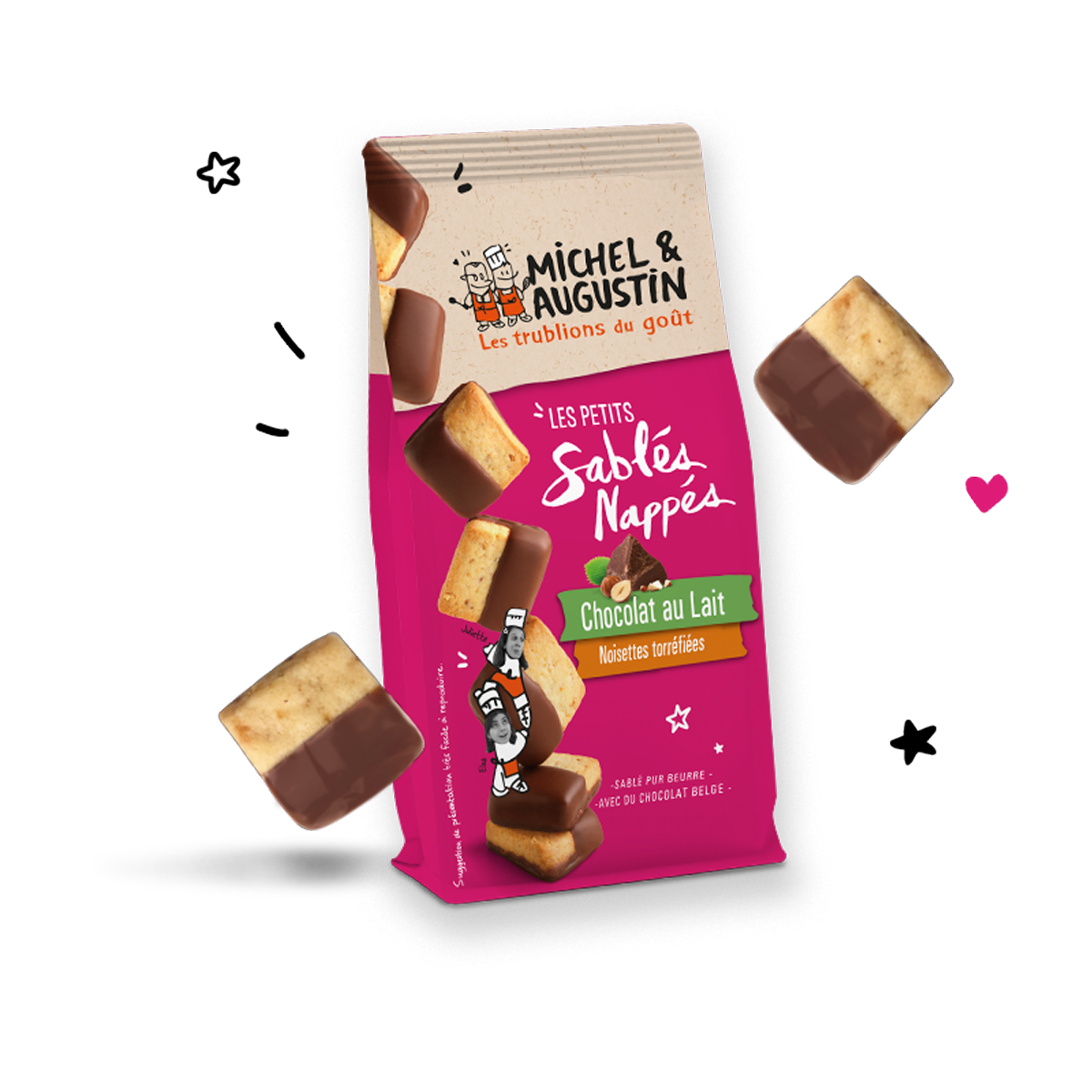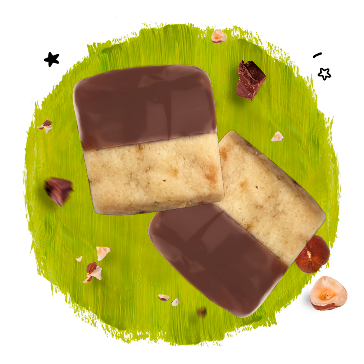 Nos jolis petits sablés nappés vont révolutionner vos pauses goûter et on n’a pas fait les choses à moitié (enfin, sauf pour la couche de chocolat bien sûr ;) ) : du beurre, des éclats de noisettes torréfiées, des œufs de poules élevées en plein air, et surtout… une moitié enrobée de chocolat au lait belge tout doux pour vous faire fondre de plaisir.