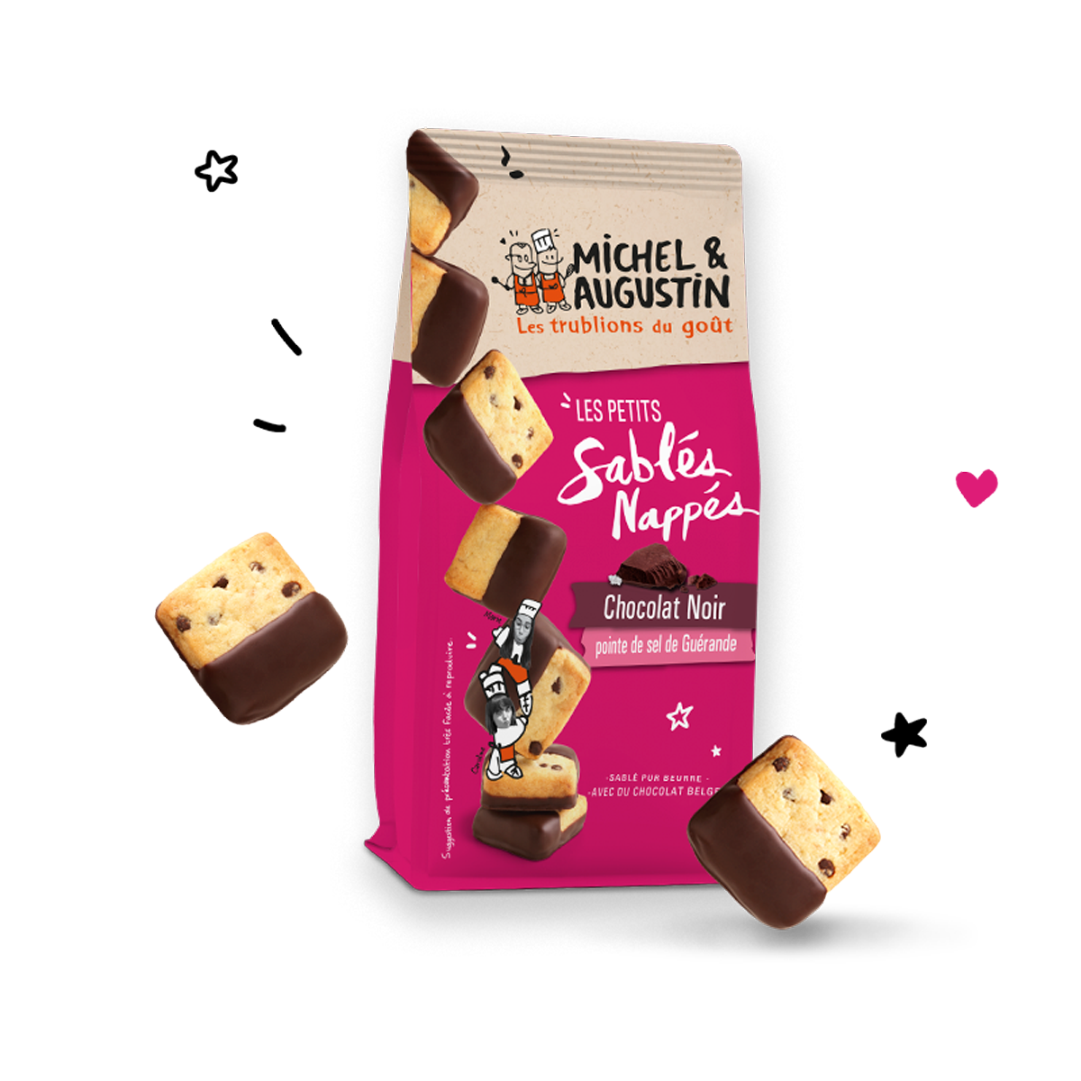 Une recette carré-ment gourmande avec de bons ingrédients pour de jolis petits sablés : du beurre, des pépites de chocolat croquantes, des œufs de poules élevées en plein air, une pointe de sel de Guérande et surtout… une moitié enrobée de chocolat noir belge fondant (parce que c’est joli, original, et surtout méga bon). Le bel équilibre entre l’amertume du chocolat et la pointe de sel qui viendra vous titiller les papilles.